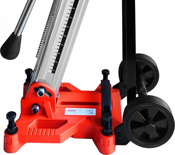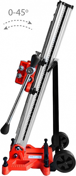 - Алюминиевая наклонная стойка (станина) с уровнем для выравнивания, основанием и колесами для удобства перемещения позволяет сверлить отверстия под углом до 45 градусов относительно плоскости крепления