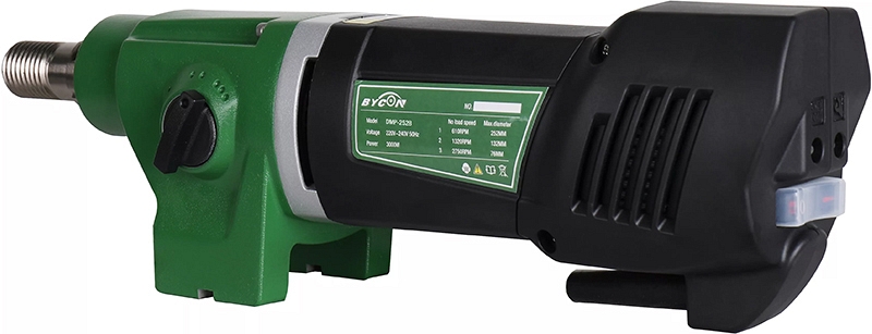 Бесщеточный двигатель алмазного бурения Bycon DMP-252B (Байкон ДМП-252Б) – новейший, легкий, надежный, мощный, бесщеточный электрический мотор для алмазного сверления отверстий Ø 32 – 252 мм в железобетоне, бетоне, кирпиче, камне и других строительных материалах, для профессионального использования, оснащенный трехскоростным редуктором, предохранительным сцеплением, индикаторами перегрузки и перегрева.
