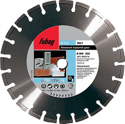 Диск алмазный отрезной Fubag BB-I (Фубаг ББ-И) предназначен для обработки всех видов бетона, армированного и промывного бетона, клинкерного кирпича, кирпича, твердого камня, кровельной черепицы на штроборезах, бензорезах, электрических резчиках, резчиках швов, камнерезных станках, плиткорезах электрических, стенорезных машинах и другой алмазной технике с подачей воды.
