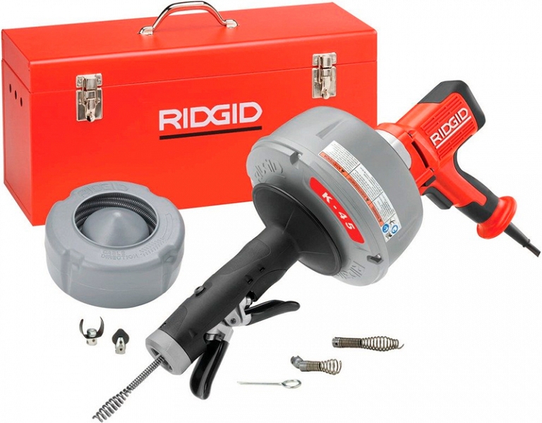 Портативная электрическая прочистная машина Ridgid K-45AF-5 (Риджид К-45АФ-5) с автоподачей двунаправленного действия Autofeed – ручная прочистная машина барабанного типа, предназначенная для прочистки сточных / канализационых труб Ø 20 – 75 мм (3/4" – 2 1/2") на длину до 15,2 м. Быстро пробивает забитые трубопроводы ванн.