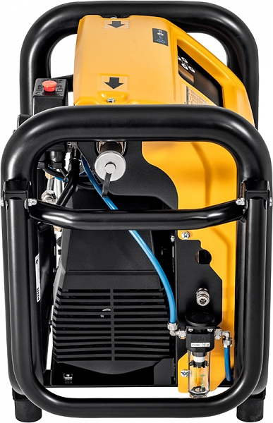 Проверенный мощный безмасляный поршневой компрессор с рычажным приводом и конденсаторным двигателем 230 В, 1500 Вт. Манометр для индикации давления воздуха в ресивере сжатого воздуха. Аварийный выключатель. - Шланги: